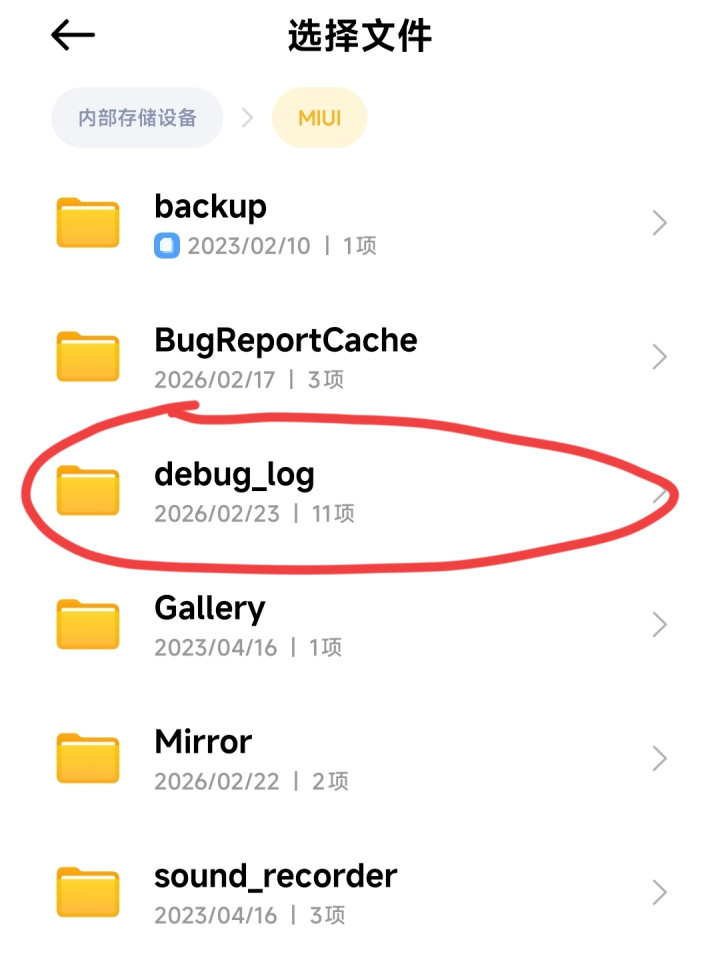 持续掀开“里面存储诞生”——找到MIUI这个字母选项——debug_log。