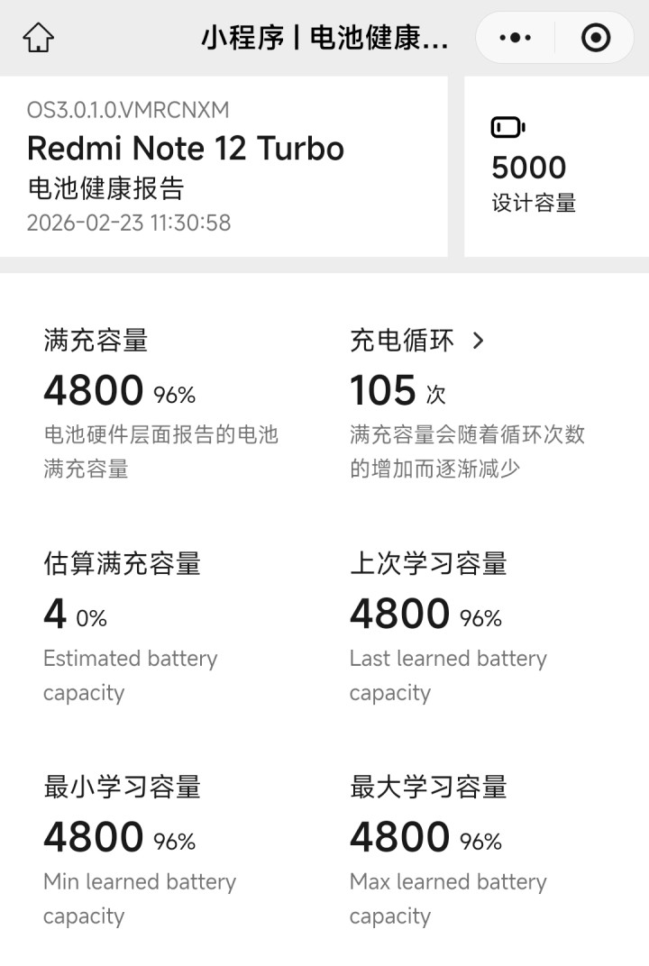 临了的电板健康度查询后果页面:我的红米旧手机,电板健康度是96%,还是充电轮回105次了。