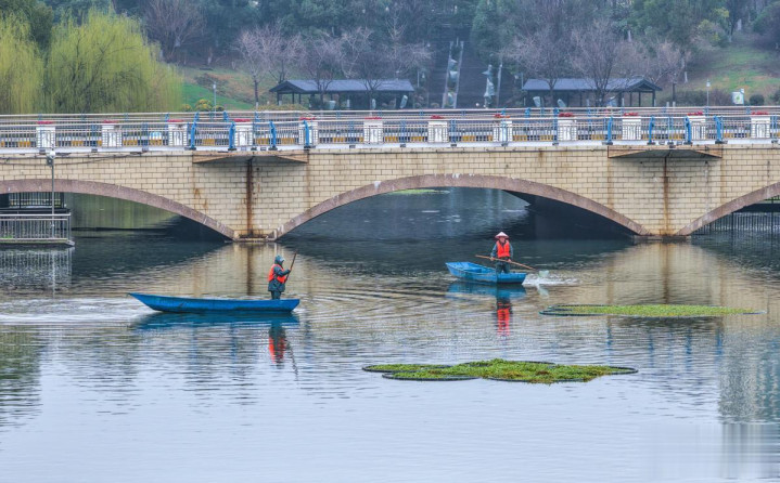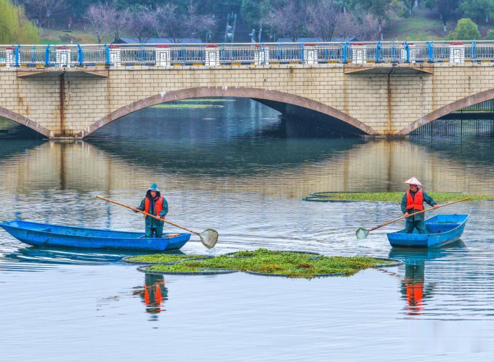 2026年2月26日,在安徽省芜湖市繁昌区繁阳镇舒缓河公园,河说念保洁员在打捞水草和杂物。(鲁君元摄/光明图片)