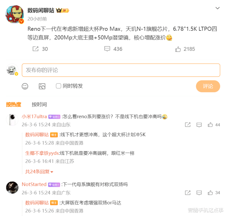不外这套设置淌若落地,价钱确定也会往上走,参考Reno15 Pro首销2949元的起售价,Reno16 Pro Max淌若加上旗舰芯片、潜望镜、LTPO直屏,起售价很可能摸到3700-4000元档,甚而更高。